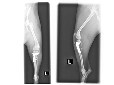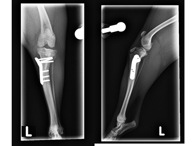 ソファから落下後、左後肢を挙げていることを主訴に来院されました。来院時も左後肢を挙上しており、左膝関節周囲の腫張も認められました。レントゲン検査を実施したところ左の脛骨近位骨幹端の骨折が確認されました。(画像 術前)